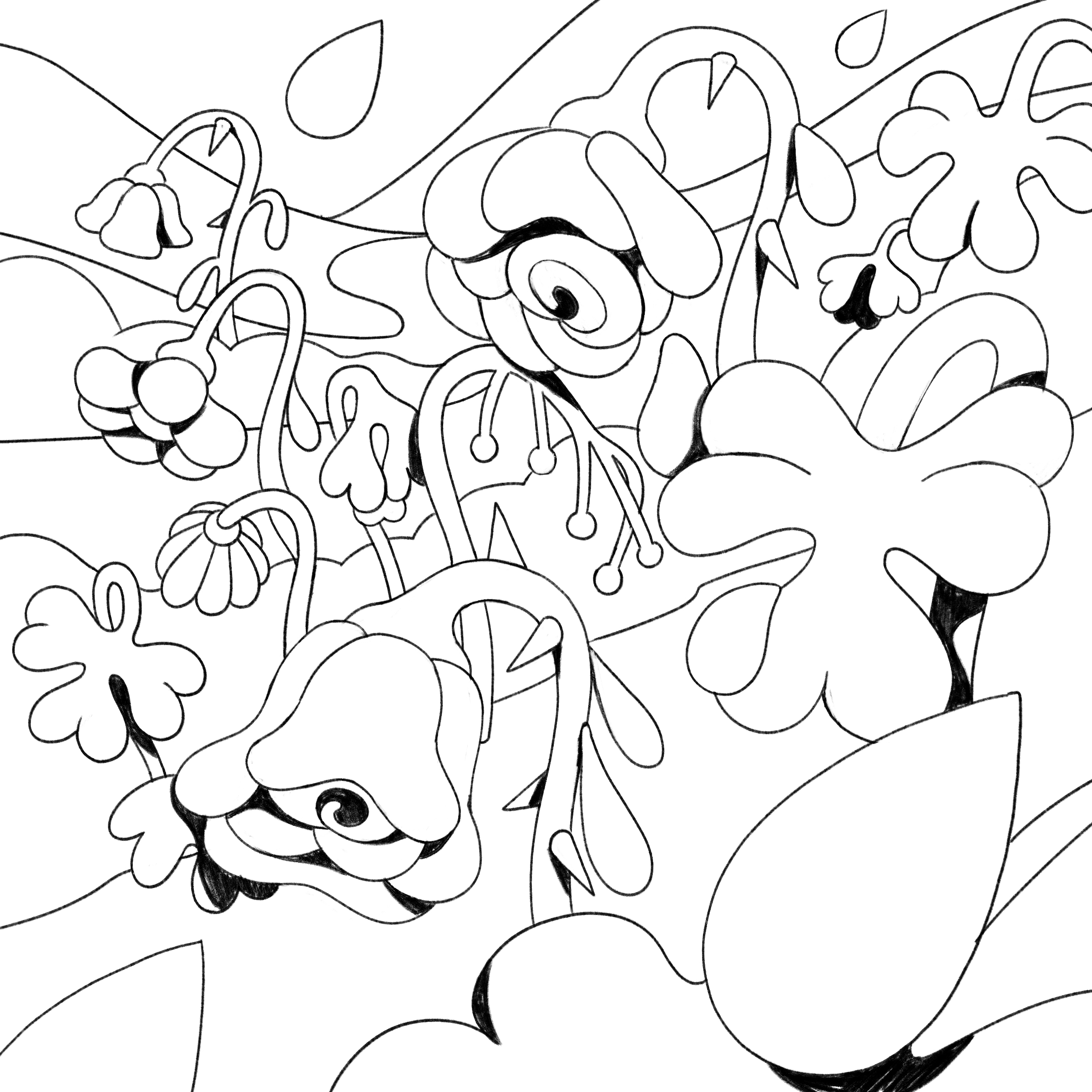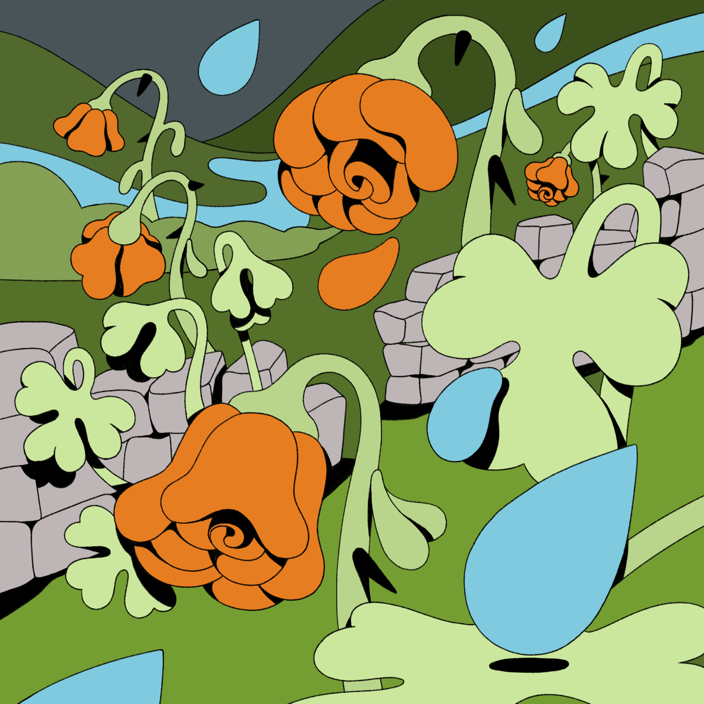 Damien had the idea of a landscape for this piece. With this in mind I thought an overgrown field of wilting, hugely scaled flowers representing people's stances and aspirations was an interesting way to convey the title and message of this piece.