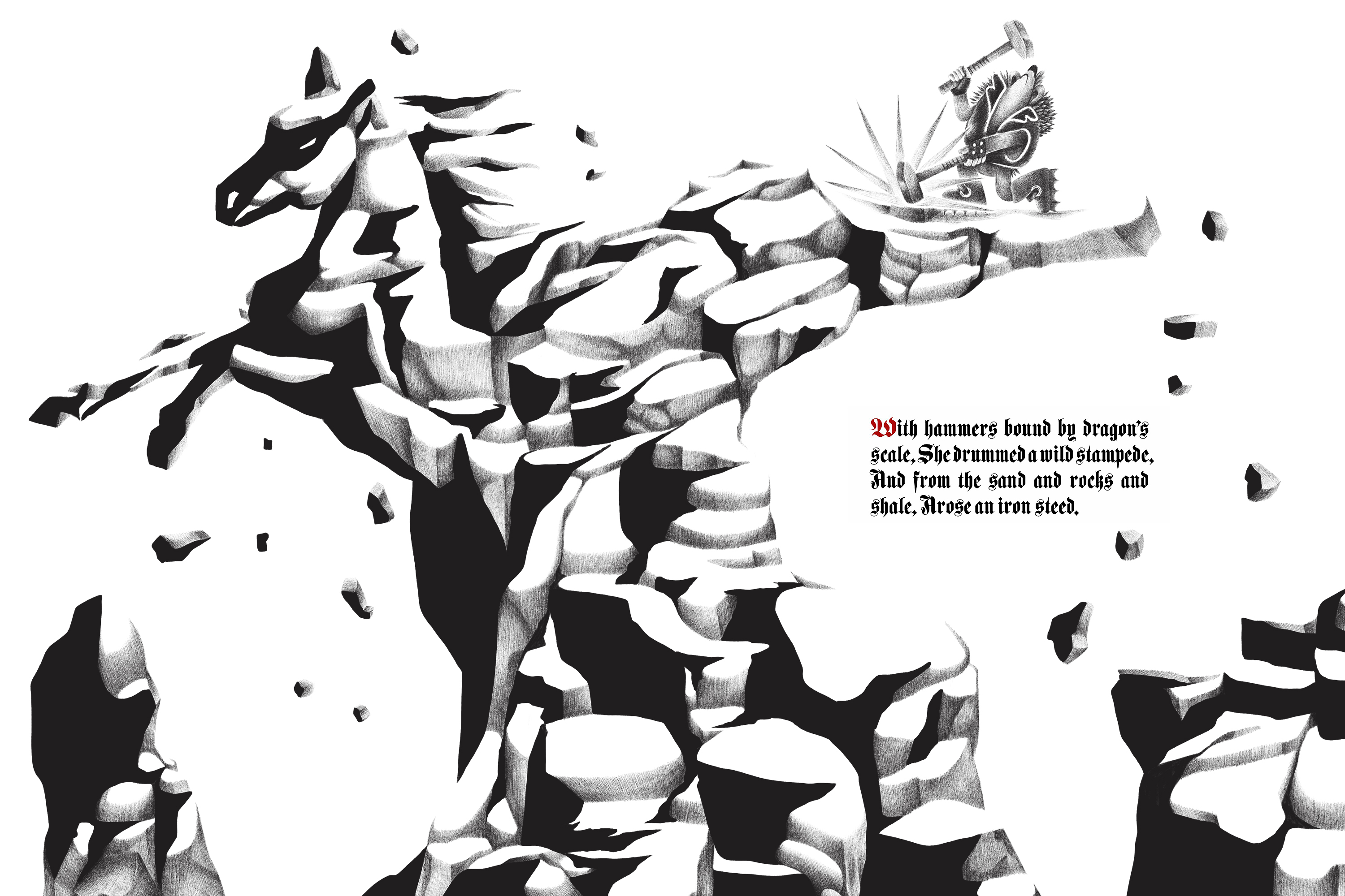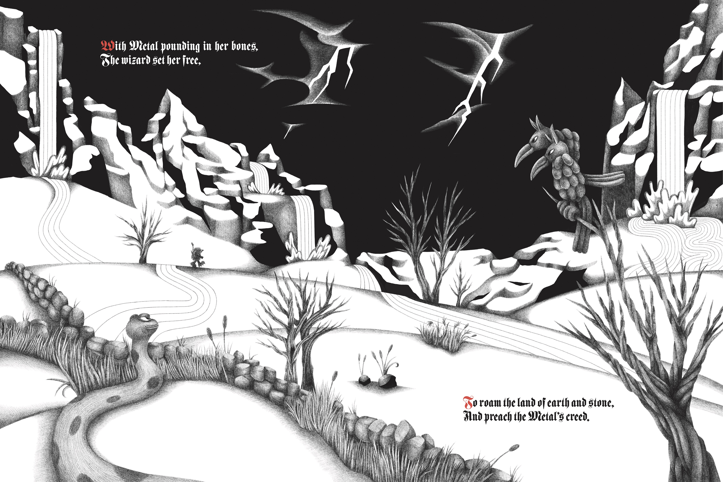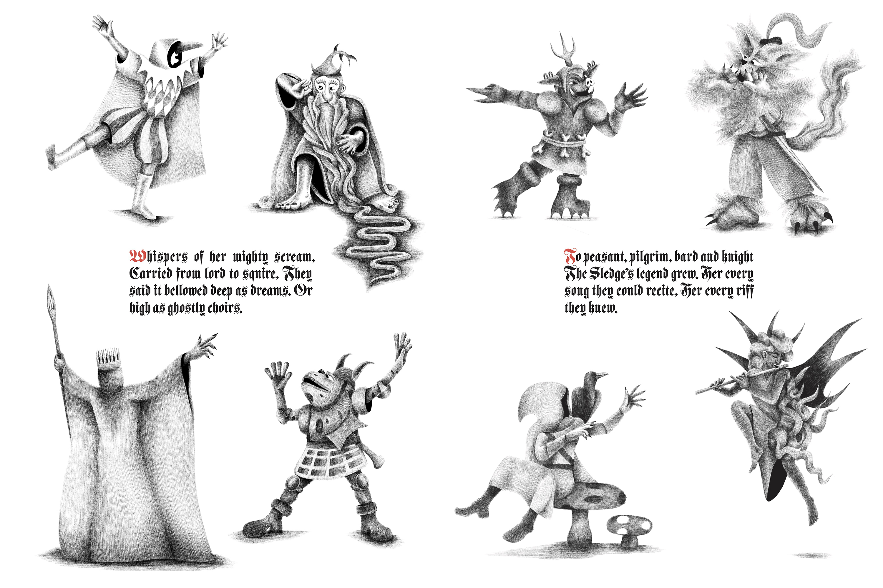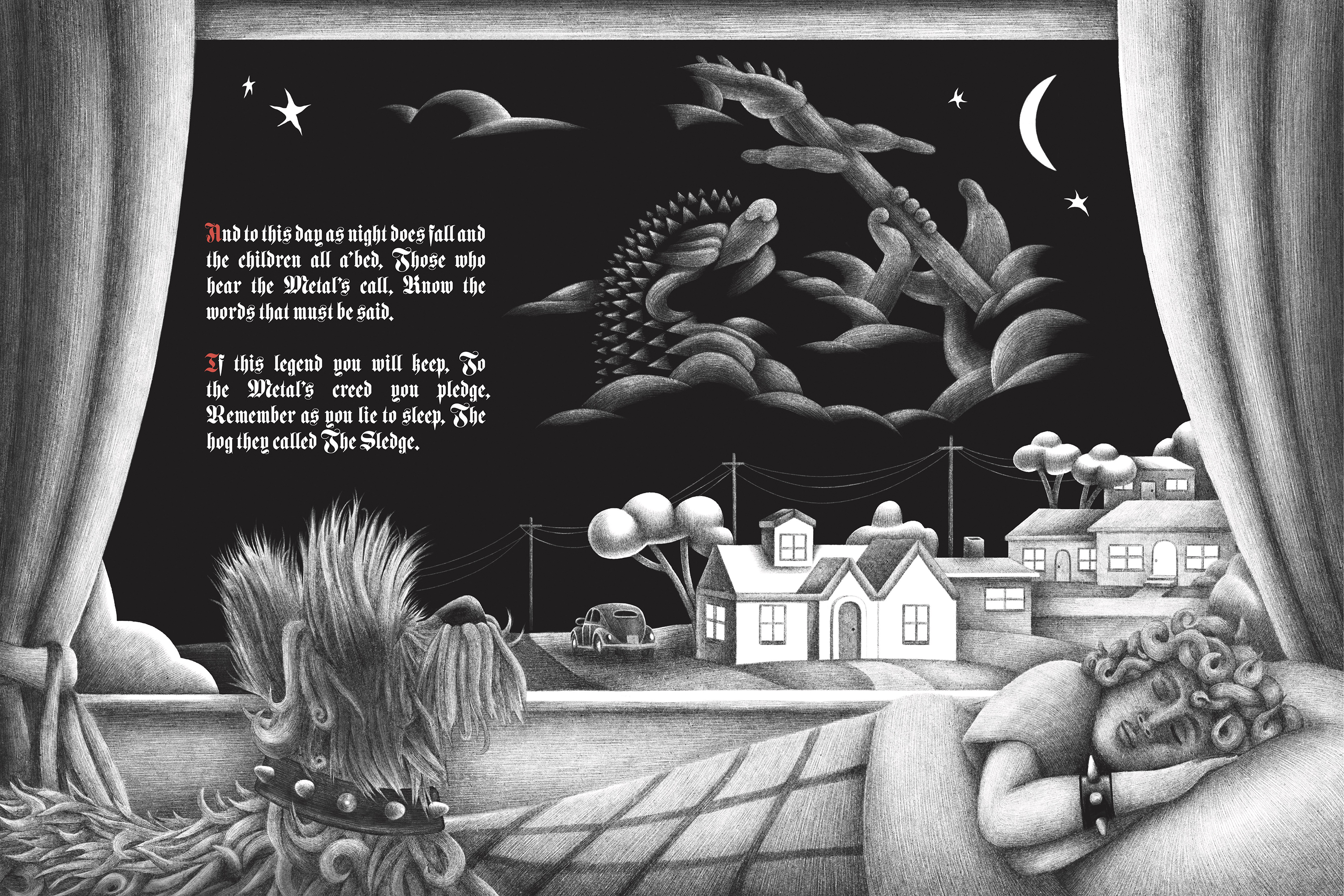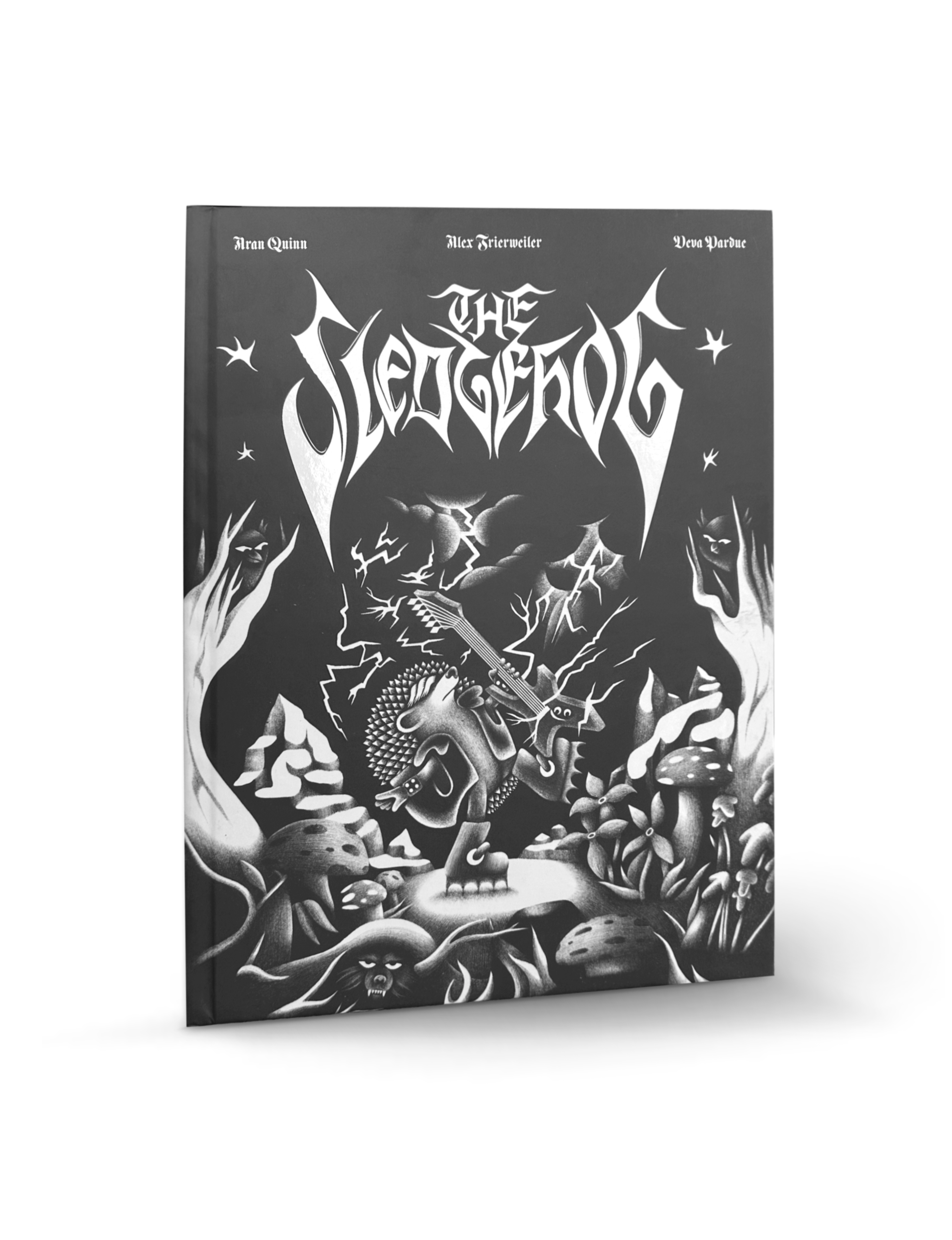 The Sledgehog is an illustrated children’s book about a medieval hedgehog that brings heavy metal into the world. Set in a fantasy world inspired by vintage metal album art and classic fairy tale illustration. Powerful prose combined with graphic black and white illustrations creates a darkly enchanting picture book that will captivate the minds of children and parents alike.